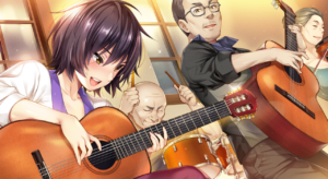 少女背对着夕阳、在教室中独自一人弹奏弹吉的样子.